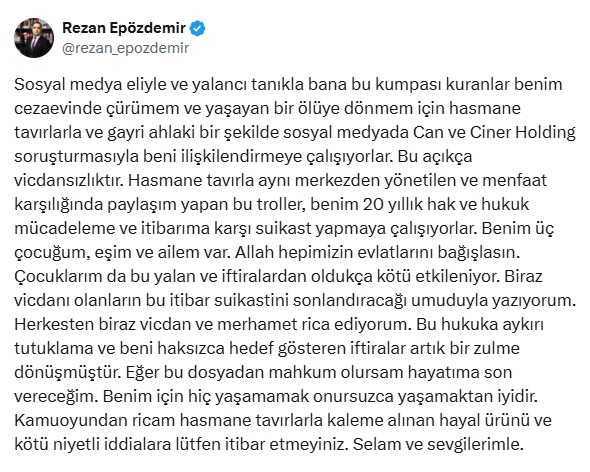 "Sosyal medya eliyle ve yalancı tanıkla bana bu kumpası kuranlar benim cezaevinde çürümem ve yaşayan bir ölüye dönmem için hasmane tavırlarla ve gayri ahlaki bir şekilde sosyal medyada Can ve Ciner Holding soruşturmasıyla beni ilişkilendirmeye çalışıyorlar. Bu açıkça vicdansızlıktır. Hasmane tavırla aynı merkezden yönetilen ve menfaat karşılığında paylaşım yapan bu troller, benim 20 yıllık hak ve hukuk mücadeleme ve itibarıma karşı suikast yapmaya çalışıyorlar. Benim üç çocuğum, eşim ve ailem var. Allah hepimizin evlatlarını bağışlasın. Çocuklarım da bu yalan ve iftiralardan oldukça kötü etkileniyor. Biraz vicdanı olanların bu itibar suikastini sonlandıracağı umuduyla yazıyorum. Herkesten biraz vicdan ve merhamet rica ediyorum. Bu hukuka aykırı tutuklama ve beni haksızca hedef gösteren iftiralar artık bir zulme dönüşmüştür. Eğer bu dosyadan mahkum olursam hayatıma son vereceğim. Benim için hiç yaşamamak onursuzca yaşamaktan iyidir. Kamuoyundan ricam hasmane tavırlarla kaleme alınan hayal ürünü ve kötü niyetli iddialara lütfen itibar etmeyiniz. Selam ve sevgilerimle."