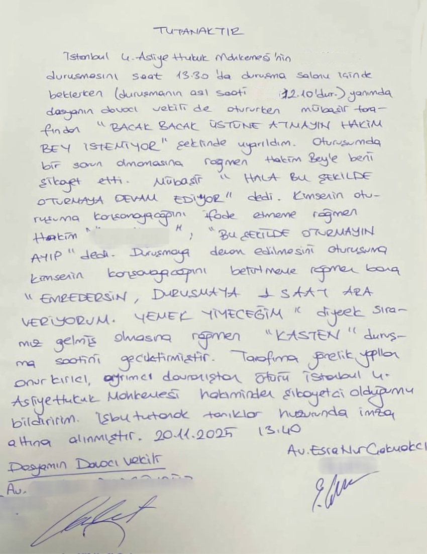 Yapılan açıklama şöyle; "?İstanbul 4. Asliye Hukuk Mahkemesi salonunda mübaşir tarafından "BACAK BACAK ÜSTÜNE ATMAYIN HAKİM BEY İSTEMİYOR" diye uyarılan, ardından bizzat Hakim tarafından "HALA BU ŞEKİLDE OTURMAYA DEVAM EDİYOR" denilerek oturuş şekli nedeniyle baskıya maruz kalan meslektaşımızın tuttuğu bu tutanak, yargının geldiği noktayı gözler önüne seriyor.