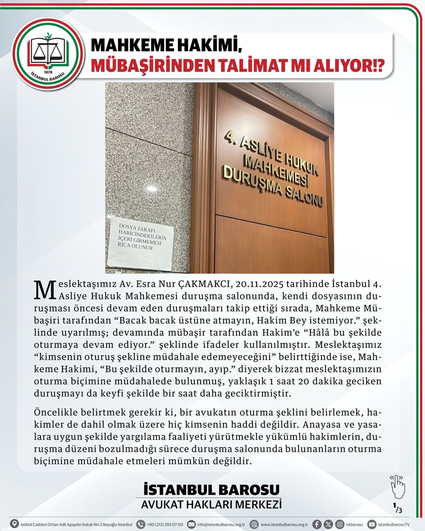 İstanbul 4. Asliye Hukuk Mahkemesi’nde duruşmada bulunan avukat Esra Nur Çakmakçı’nın oturma şekline, mübaşir tarafından "bacak bacak üstüne atmayın hakim bey istemiyor" denilerek müdahale edildi. Çakmakçı, hem Hakimler ve Savcılar Kurulu’na hem de mübaşir açısından İstanbul Adalet Komisyonu’na ayrı ayrı şikayette bulunduğunu açıkladı.
