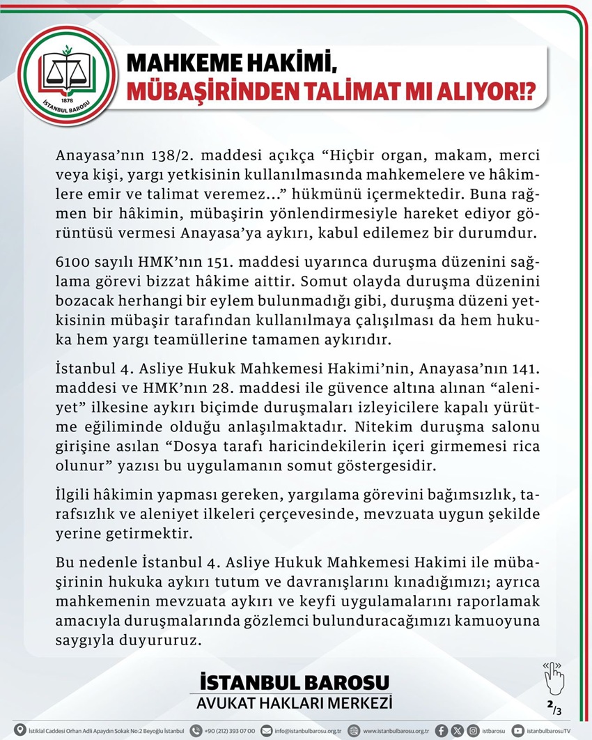 İstanbul Barosu Avukat Hakları Merkezi'nden yapılan açıklamada "İstanbul 4.Asliye Hukuk Mahkemesi Hakimi ile mübaşirinin hukuka aykırı tutum ve davranışlarını kınadığımızı; mahkemenin bu keyfi uygulamalarını raporlamak amacıyla duruşmalarda gözlemci bulunduracağımızı kamuoyuna saygıyla duyururuz" denildi.