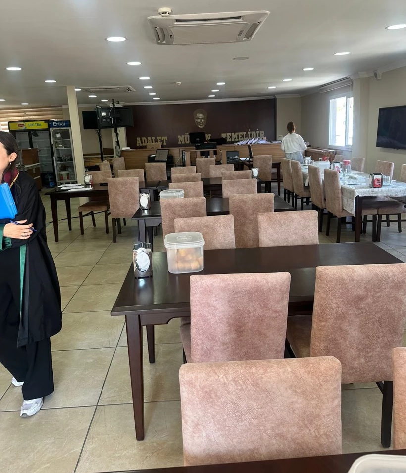 Yemek masaları, salatalar ve ekmeklerin bulunduğu yemekhane içinde oluşturulan duruşma salonunda görülen davalar hukukçular içinde tartışma konusu oldu.