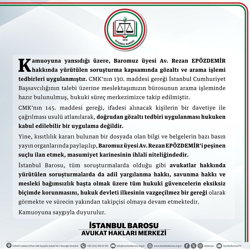 İstanbul Barosu'nun konuya ilişkin sosyal medya hesabından yaptığı açıklamada "Tüm soruşturmalarda olduğu gibi avukatlar hakkında yürütülen soruşturmalarda da adil yargılanma hakkı, savunma hakkı ve mesleki bağımsızlık başta olmak üzere tüm hukuki güvencelerin eksiksiz biçimde korunması, hukuk devleti ilkesinin vazgeçilmez bir gereğidir" ifadeleri kullanıldı.