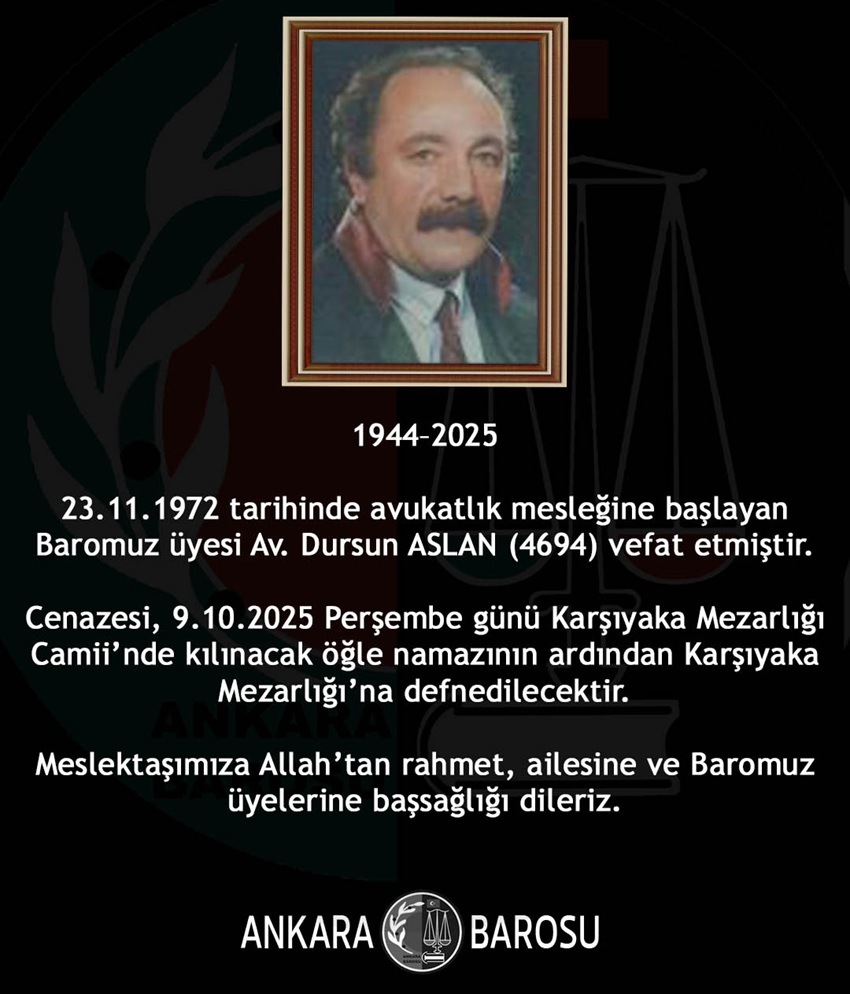 Ankara Barosu üyesi Avukat Dursun Aslan (4694) vefat etti.