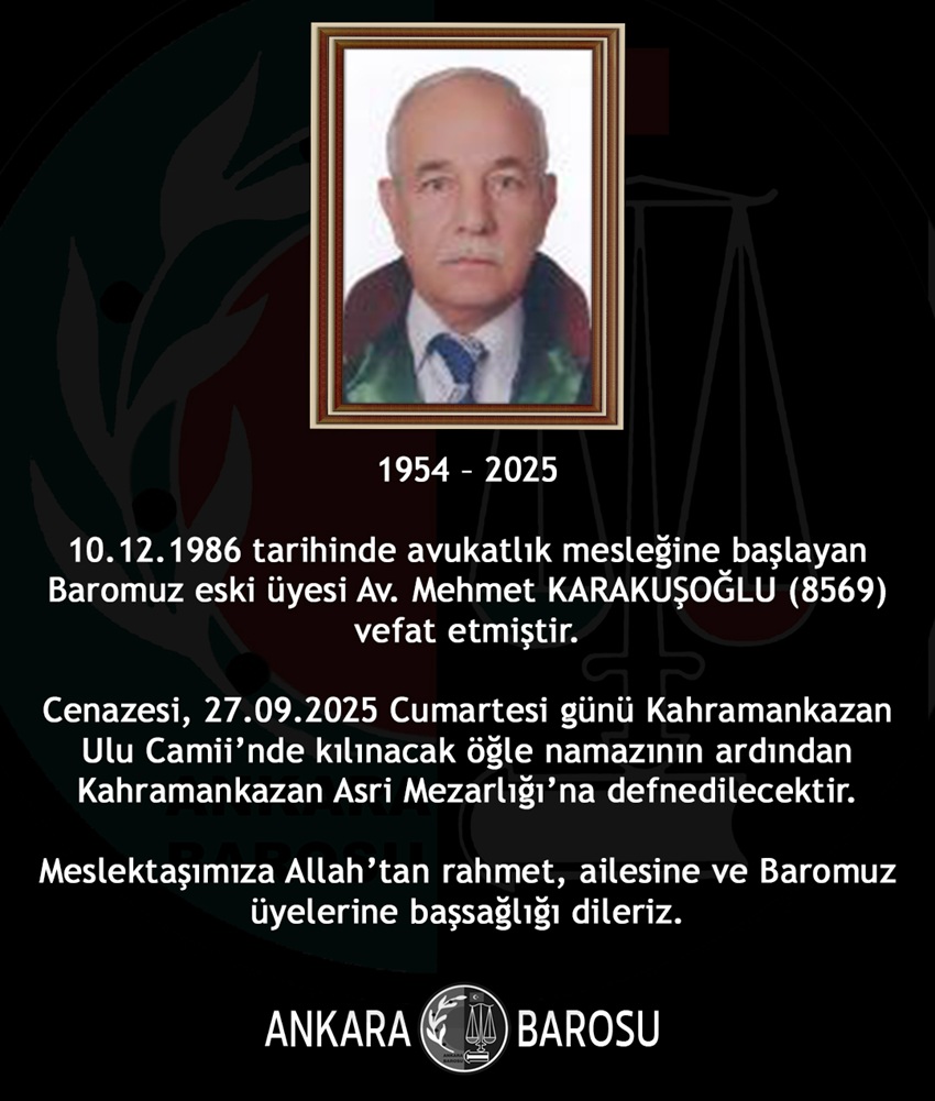 Ankara Barosu eski üyesi Avukat Mehmet Karakuşoğlu (8569) vefat etti.