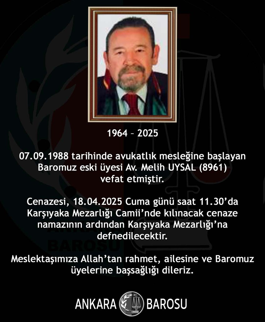 Ankara Barosu eski üyesi Avukat Melih Uysal (8961) vefat etti.