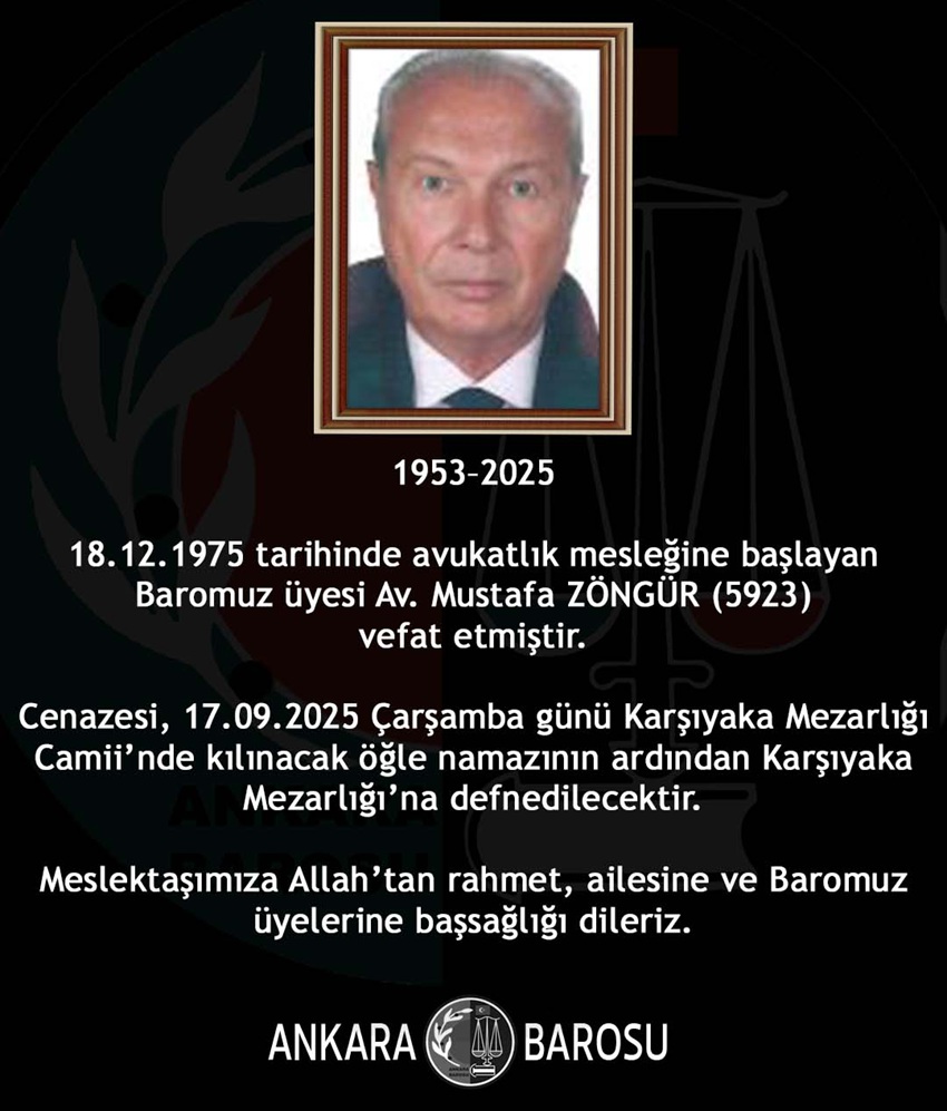 Ankara Barosu üyesi Avukat Mustafa Zöngür (5923) vefat etti.