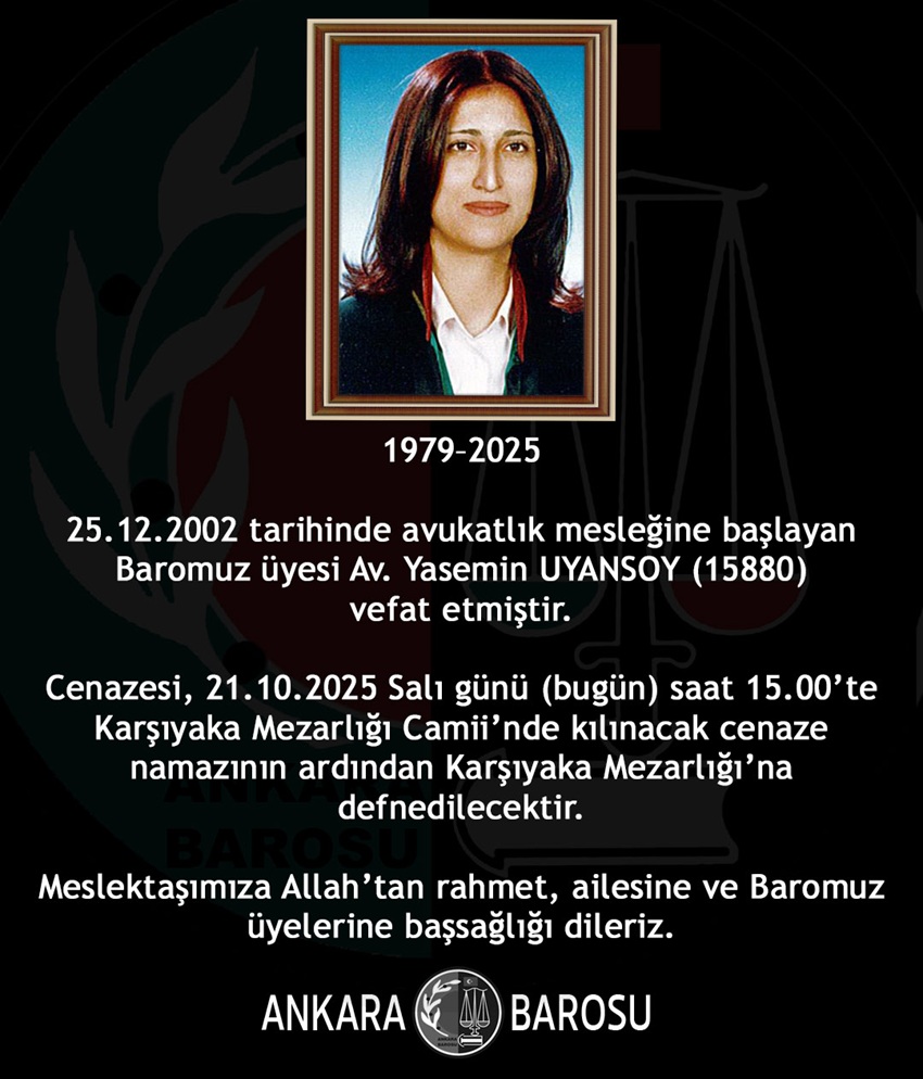 Ankara Barosu üyesi Avukat Yasemin Uyansoy (15880) vefat etti.